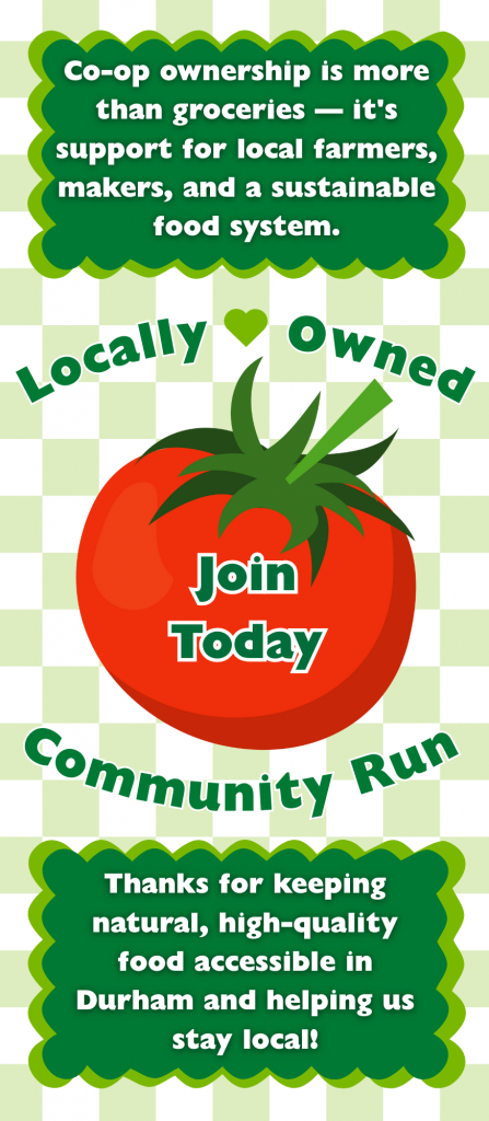 What makes Durham Co+op Market unique is our ownership structure — we’re owned by the community, not outside investors. When you support the Co+op, you’re also supporting a local institution that reinvests profits back into Durham. We prioritize the needs and feedback of our neighbors in every decision we make.