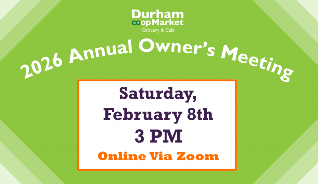 The 2026 Durham Co-op Market Annual Owner’s Meeting is coming up on Saturday, February 8th at 3 PM, and this year it’s all happening online via Zoom.