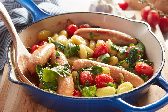 Packaged gnocchi makes this quick weeknight dinner easy to get on the table. Because it cooks in just minutes, gnocchi is even faster than pasta, and tossing it in a quick sauté of sausage and juicy grape tomatoes makes a hearty meal. You can even use plant-based sausage in this for an herbivorous meal everyone will love.